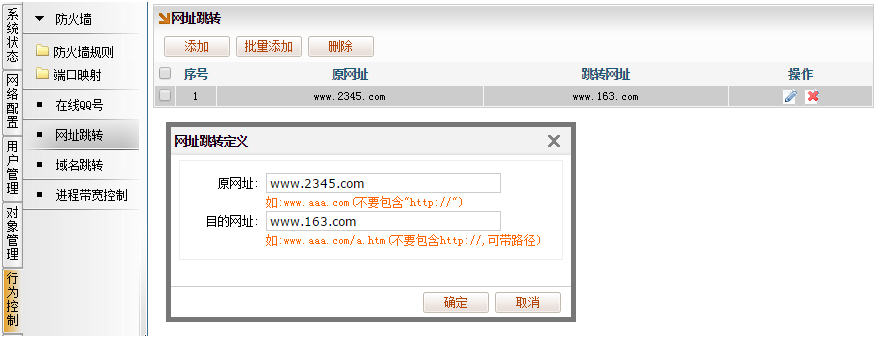 答复:[行为管理]→[网址跳转],点击添加网址跳转规则,跳转有如下方式