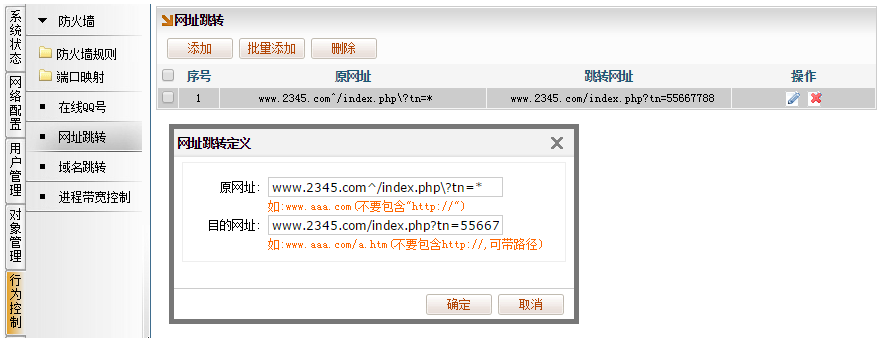 Ø 正则表达式匹配:原网址“www.2345.com^/index.php\?tn=*”,目的网址“www.2345.com/index.php?tn=55667788”。表示匹配指定链接后的任意字符串,只要是: