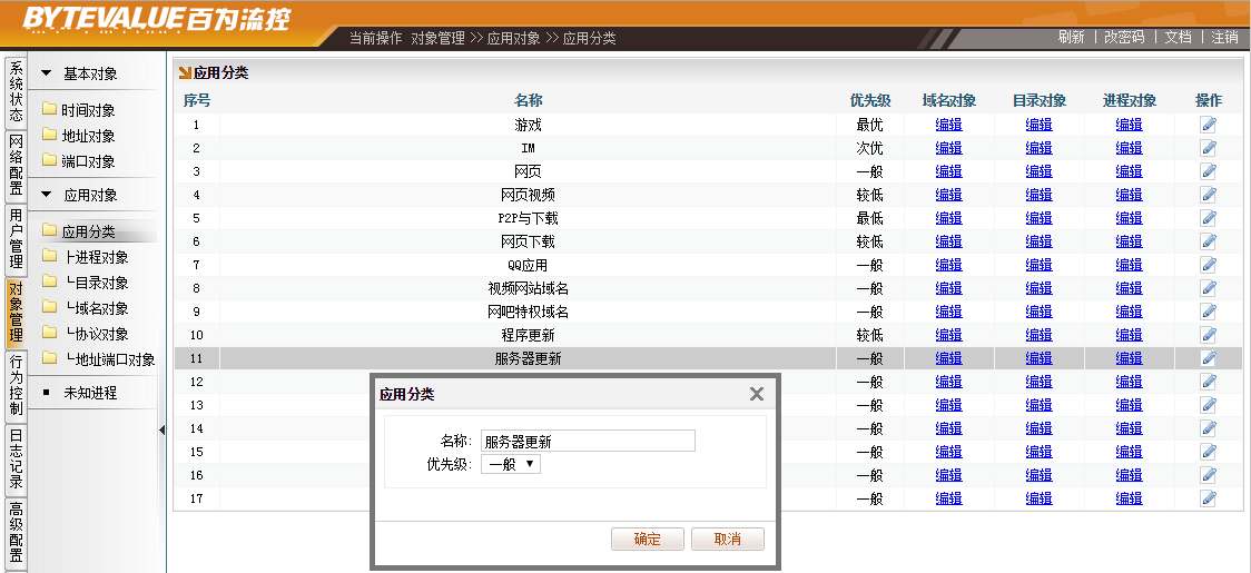 1、[对象管理]→[应用对象],双击自定义的分类,比如“自定义1”,为了便于使用,将其命名为“服务器更新”