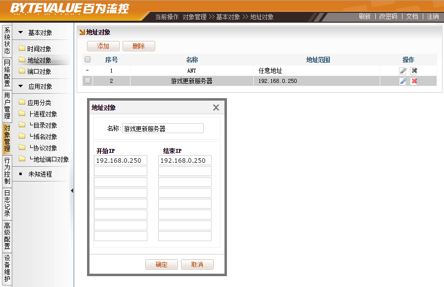 3、[对象管理]→[基本对象]→[地址对象],添加地址对象,比如命名为“游戏更新服务器”,并填入游戏更新服务器的IP