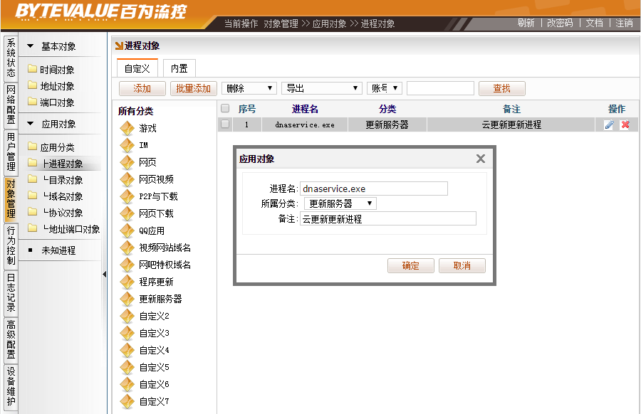 2、[对象管理]→[进程对象],在“自定义”里,点击“添加”,比如更新软件的名称为“dnaservice.exe”,选择分类“更新服务器”,备注则根据实际情况自行备注。