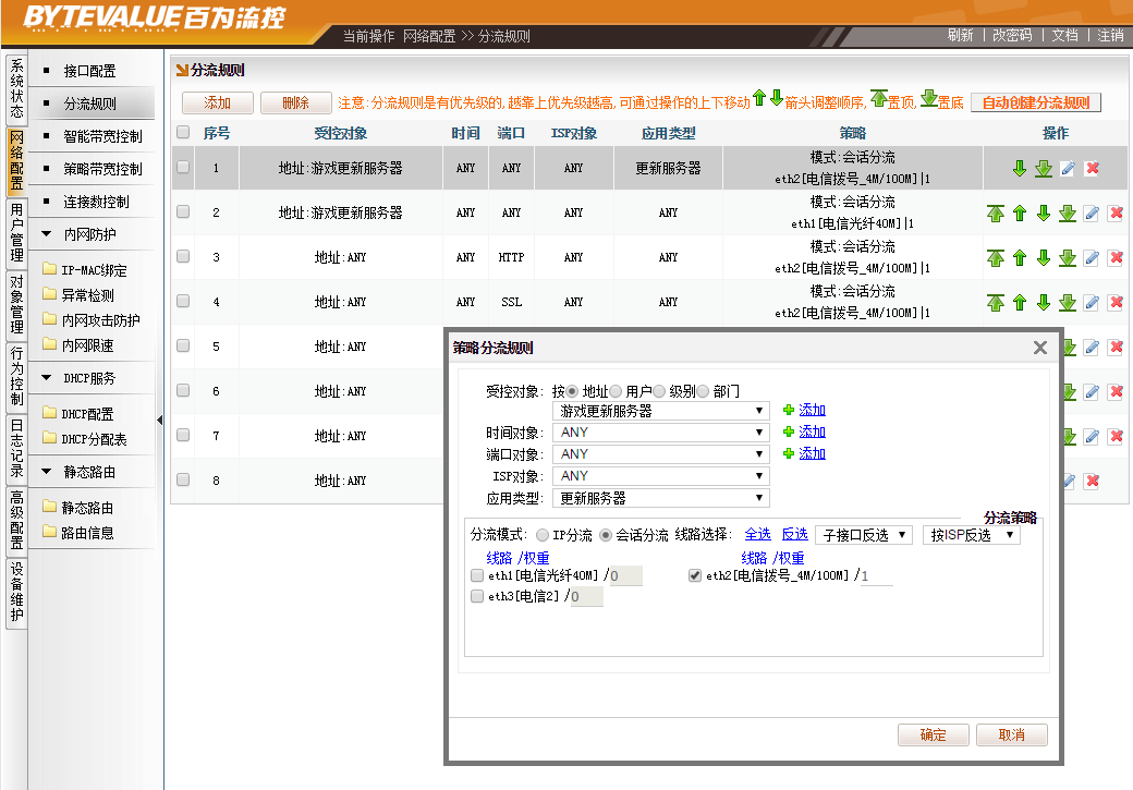 4、[网络配置]→[分流规则],添加“分流规则”,“受控对象-地址”选择“游戏更新服务器”,“应用对象”选择“更新服务器”,“时间对象、端口对象、ISP对象”均为“ANY”,勾选指定要走的外网线路,使用会话分流,将该规则置顶。