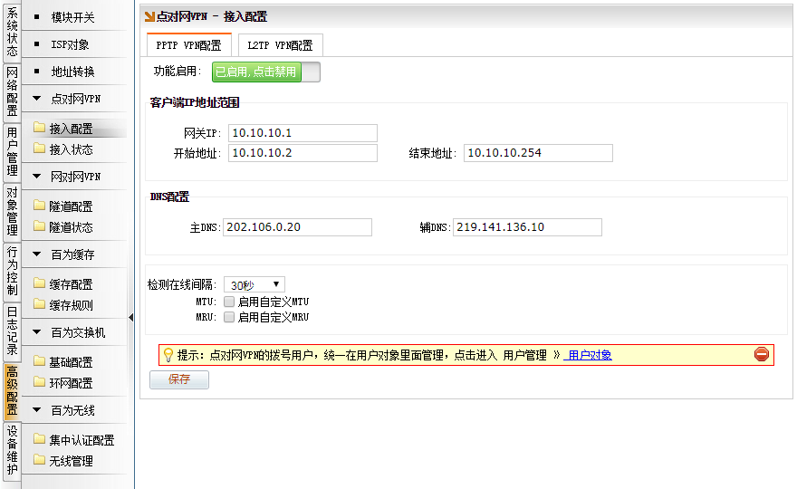 [高级配置]→[点对网VPN]→[PPTP VPN配置]