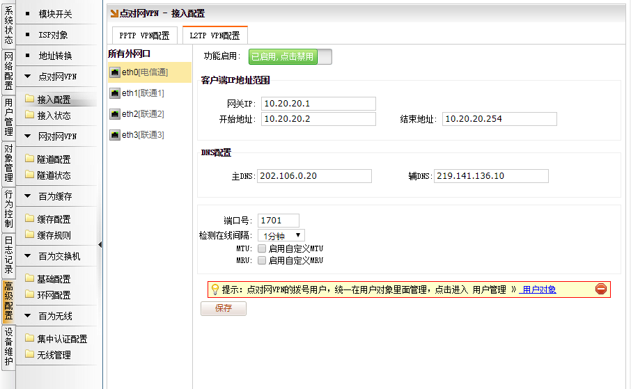 [高级配置]→[点对网VPN]→[L2TP VPN配置]