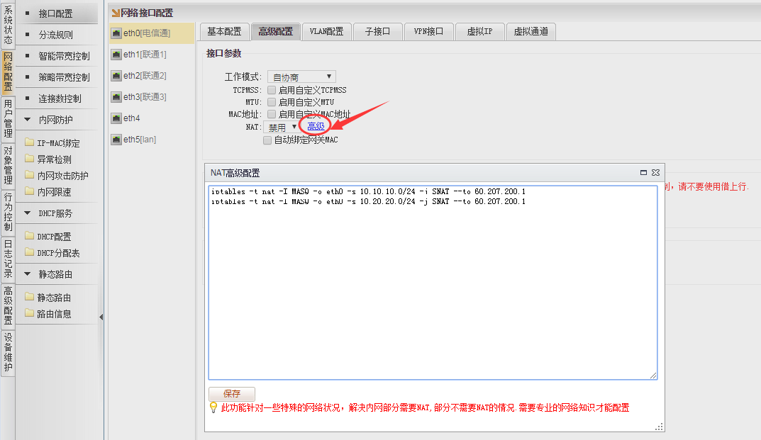 [网络配置]→[接口配置],选择电信通的接口,比如eth0,进入[高级配置]