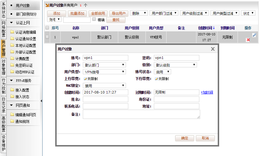 [用户管理]→[用户对象],添加用户,选择用户类型“VPN拨号”,自定义账号名和密码。