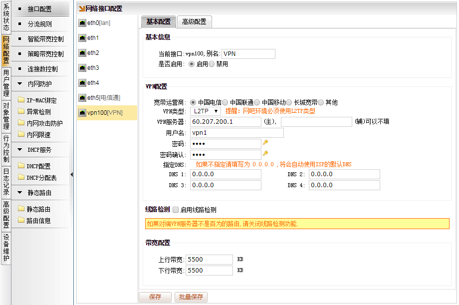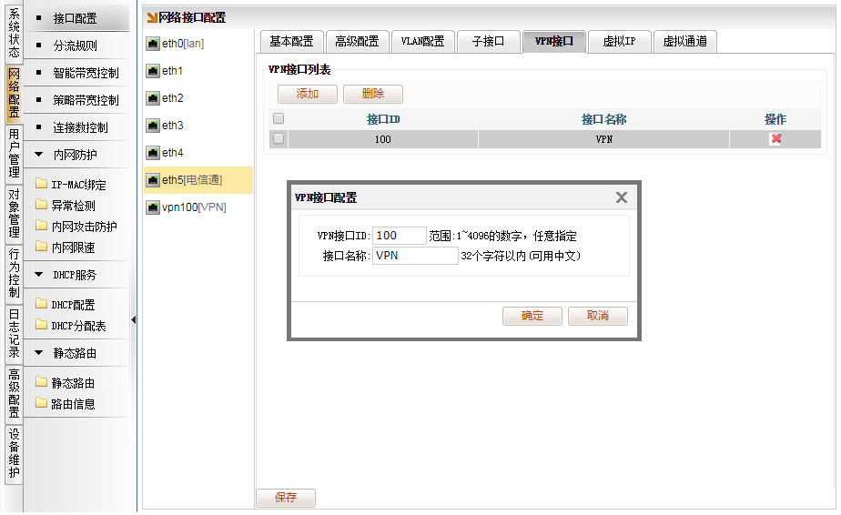[网络配置]→[接口配置],选择电信通的接口,比如eth5,点击“VPN接口”