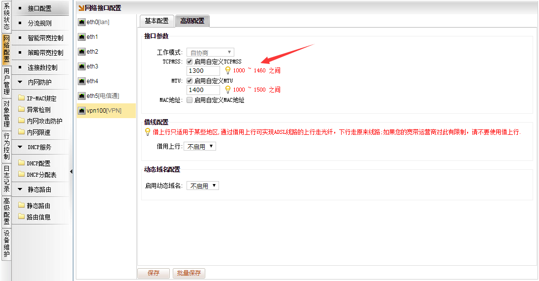 [网络配置]→[接口配置],选择VPN的接口,比如vpn100,点击“高级配置”