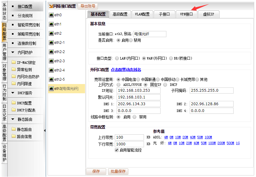 [网络配置]→[接口配置],选择WAN口,比如电信光纤的口,并点击进入“VPN接口” 的页面