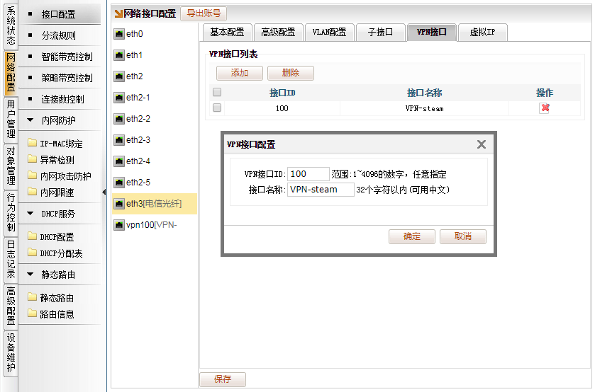 添加,自定义个VPN接口ID,比如100 ; 接口名称,比如命名为:VPN-steam