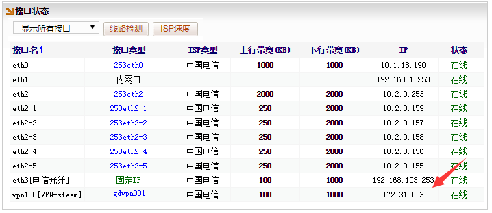 重启路由后,点击[系统状态]→[接口状态],如VPN接口,成功拨号在线,表示VPN建立成功。