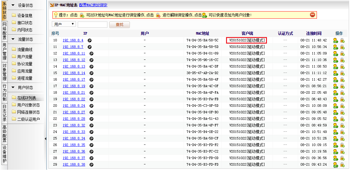 查看客户端--点击[系统管理]→[在线IP列表],可在左边栏看到有运行客户端的机器,如下图所示,如若看到有客户端的版本号,即说明客户端已经工作。