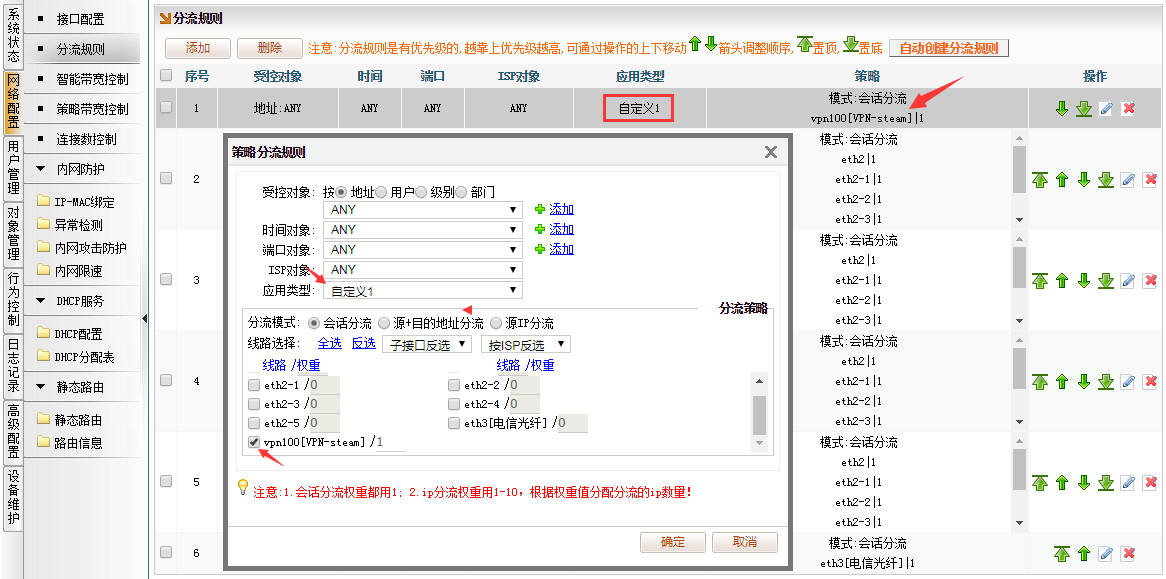 [网络配置]→[分流规则],添加,受控对象、时间、端口、ISP对象,均选择为“ANY”,应用类型,选择为“自定义1”,勾选线路vpn100。添加后规则置顶。