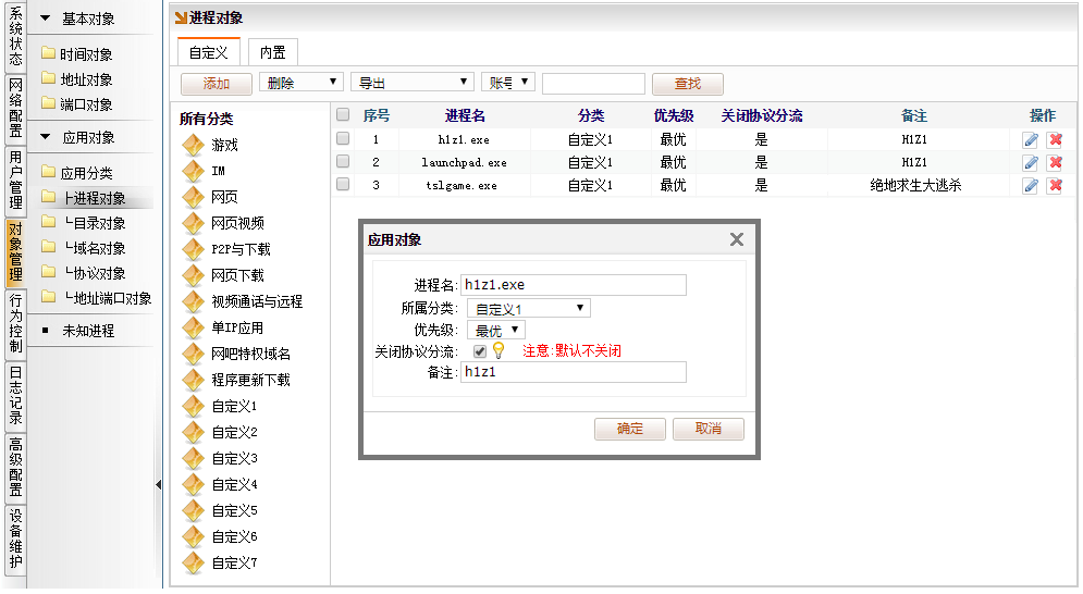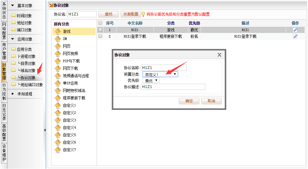 [对象管理]→[应用分类]→[协议对象],修改协议的分类为,以修改H1Z1为例。搜索协议"H1Z1",修改分类为“自定义1”,点确认.