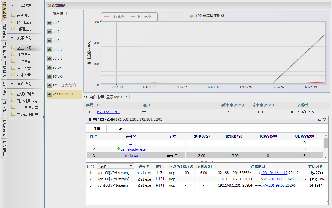 [系统状态]→[流量状态]→[流量曲线],选择VPN接口,再点击玩家的 IP地址,可弹出“用户连接跟踪表”对话框。选择分流的游戏进程,比如h1z1.exe