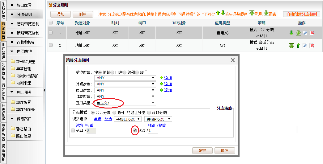 2、[网络配置]→[分流规则],添加“分流规则”,“应用类型”选择“自定义1”,“受控对象、时间对象、端口对象、ISP对象”均为“ANY”,勾选指定要走的外网线路。最后将该规则置顶。