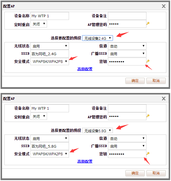 比如需要分别2.4G、5.8G 的频段进行设置,比如下图设置2.4G、5.8G 的SSID名称以及无线密码
