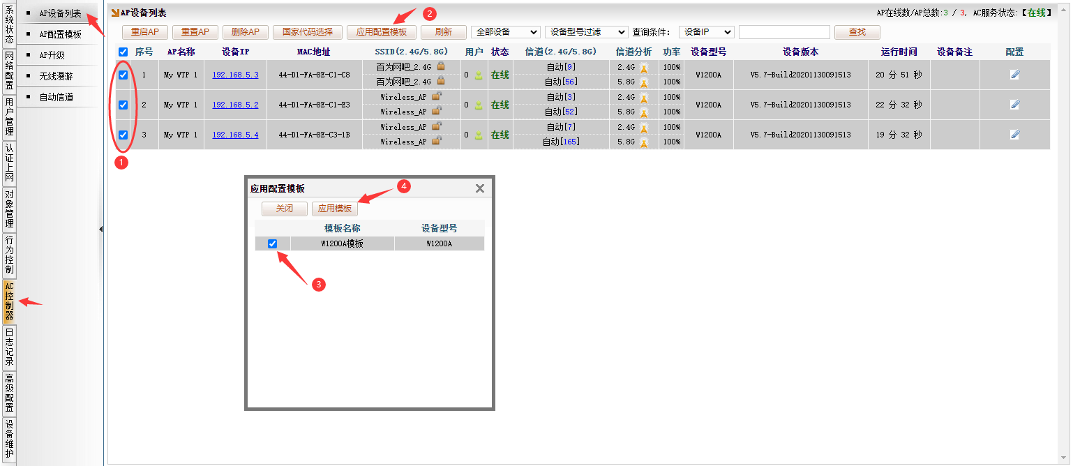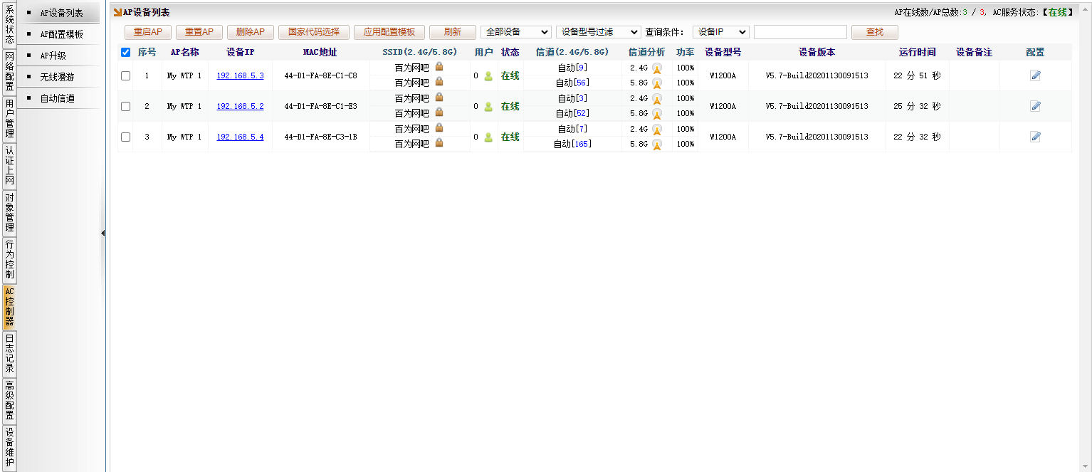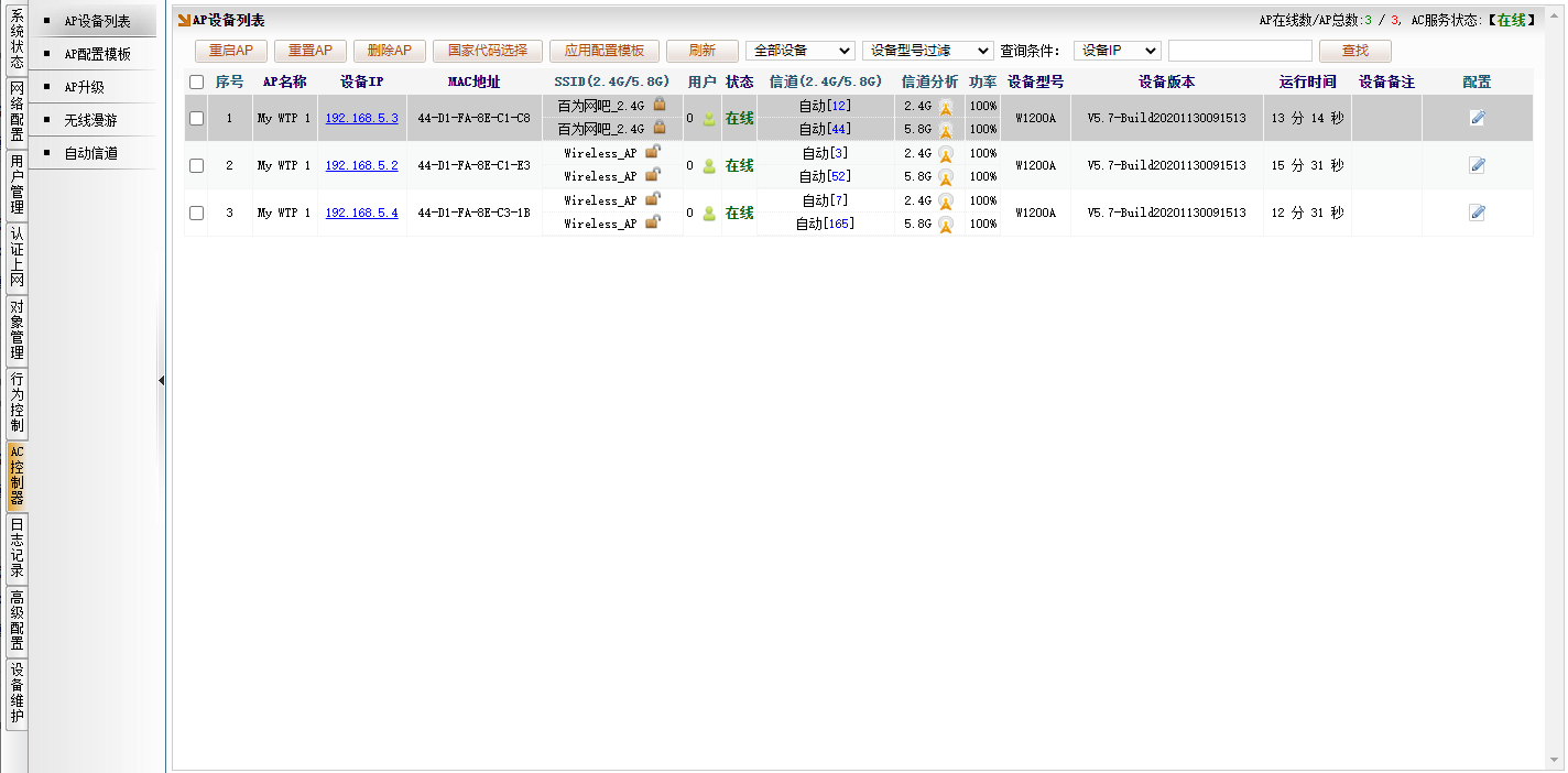 [AC控制器]→[AP设备列表],图下图所示,看到了接入了三个 W1200A 的AP上线。