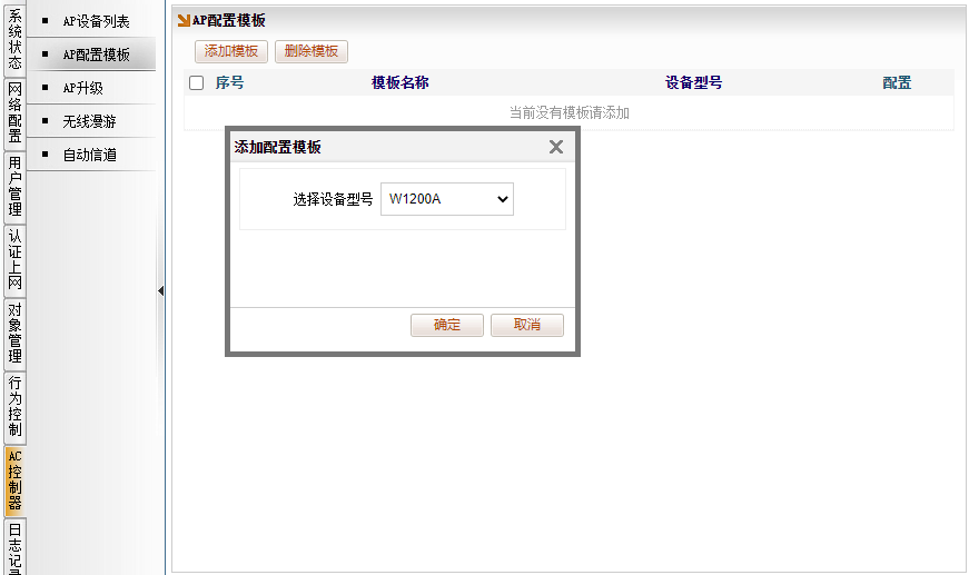 [AC控制器]→[AP配置模版],点击“添加模版”选择设备型号,点击确定。