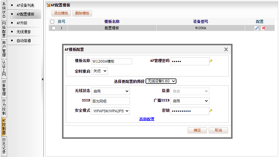 以下示例,修改 2.4G 和 5.8G 频段用相同的SSID,密码也一样,模板名称定义为 “W1200A模板”