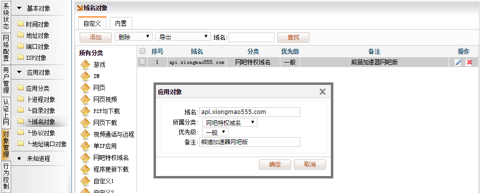 1、[对象管理] →[应用对象]→[域名对象]。添加要分流的域名 api.xiongmao555.com 、备注,所属分类,比如选择为“网吧特权域名”。