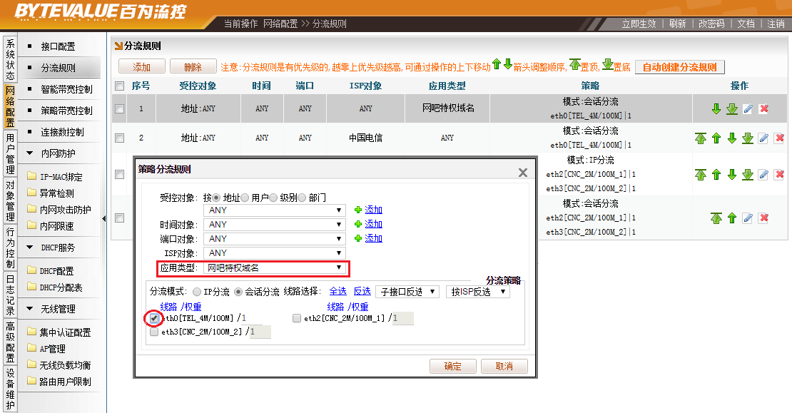 2、[网络配置]→[分流规则],添加“分流规则”,“应用类型”选择“网吧特权域名”,“受控对象、时间对象、端口对象、ISP对象”均为“ANY”,勾选指定要走的外网线路。最后将该规则置顶。