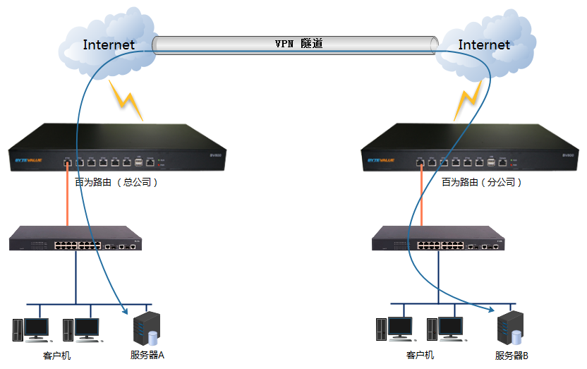 说明:百为路由网对网VPN服务,是为两个独立的网络,建立VPN隧道,实现两个内部之间资源互访。