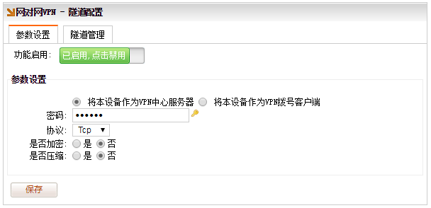 [参数设置],选择 “将本设备作为VPN中心服务器” ,自定义密码,加密与压缩均选择 “否” 。