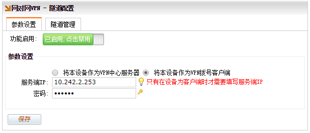 [参数设置],选择 “将本设备作为VPN拨号客户端” ,填入VPN服务端的IP,填入与服务端一样的密码。