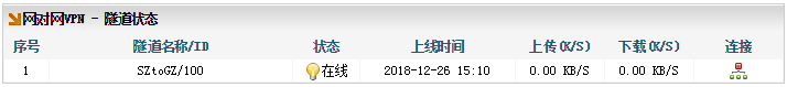 隧道成功建立后,可在VPN服务端、客户端,在[高级配置]→[网对网VPN]→[隧道状态],看到建立的连接,如下图所示: