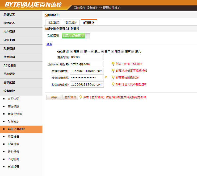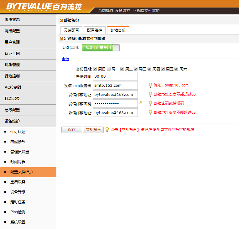 [设备维护]→[配置文件维护]→[邮件备份],