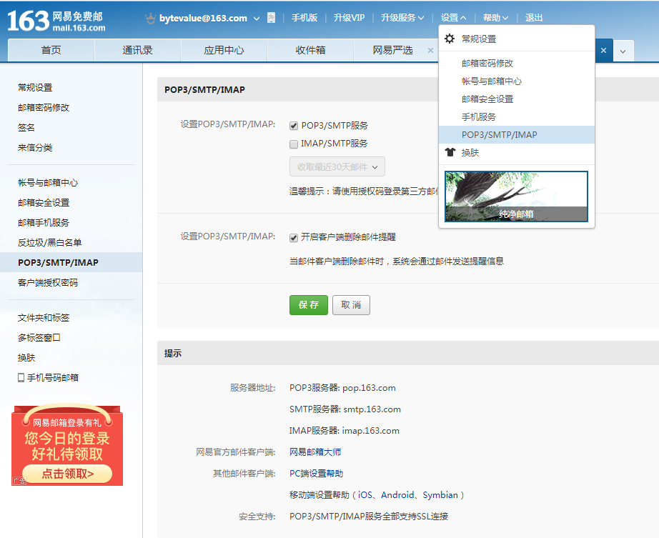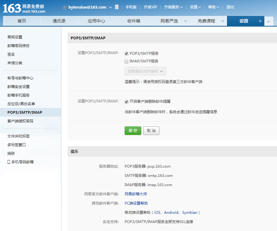登录到163邮箱,点击[设置]→[POP3/SMTP/IMAP] ,勾选 POP3/SMTP服务