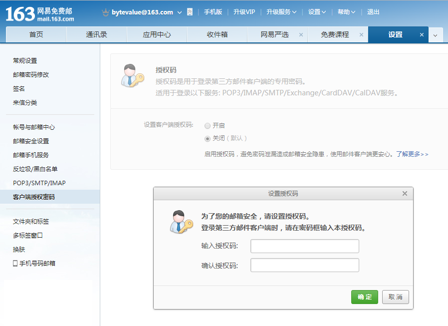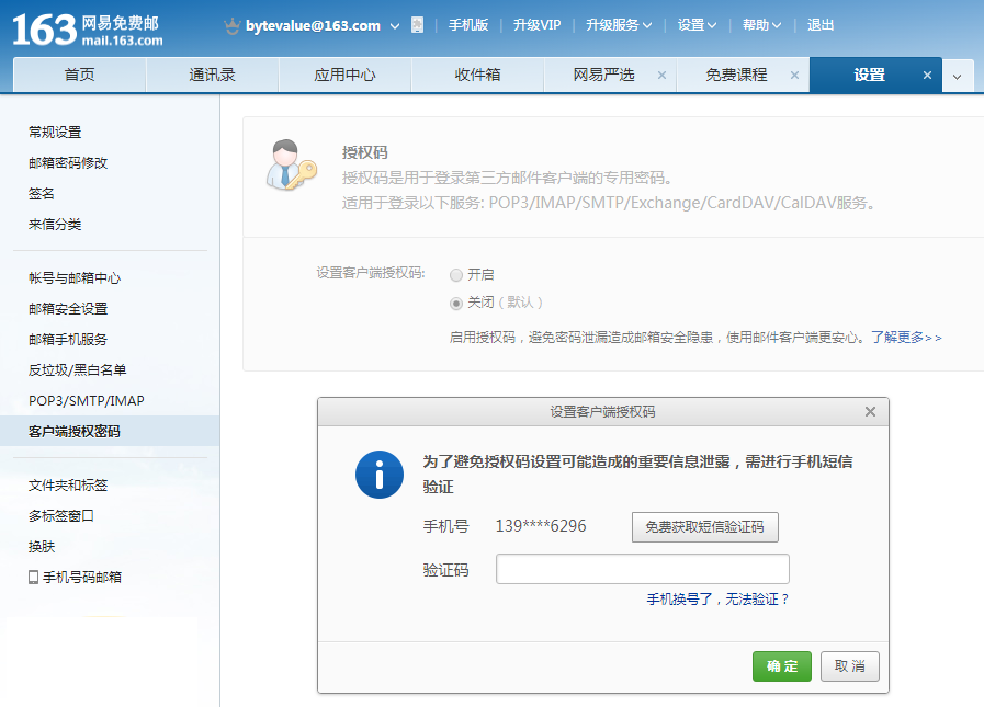 点击左边栏 [客户端授权密码],点击 “开启”,提示要求,输入手机获得的验证码。