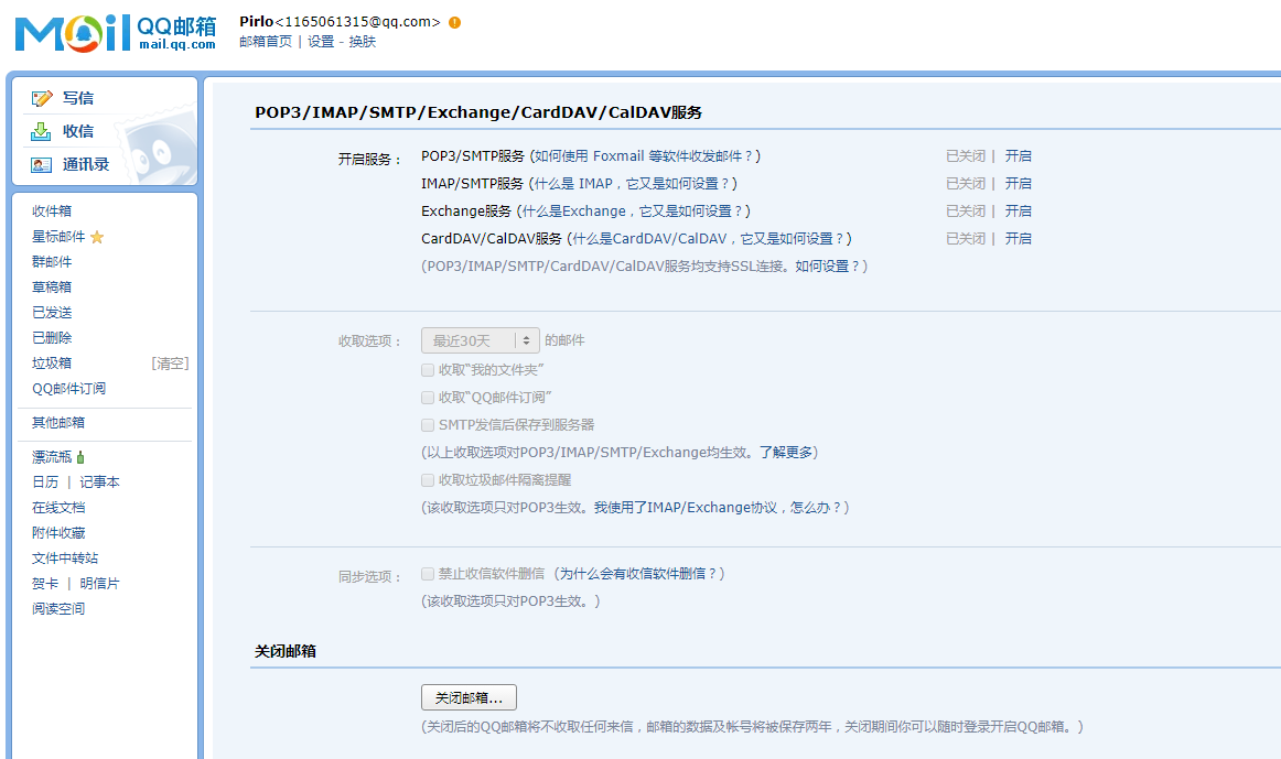 下拉菜单,可看到“POP3/IMAP/SMTP/Exchange/CardDAV/CalDAV服务”