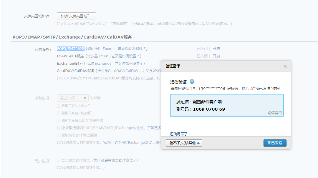 使用手机关联的邮箱,编辑短信内容 “配置邮件客户端”,发送到 1069070069 。短信发送后,点击“我已发送”