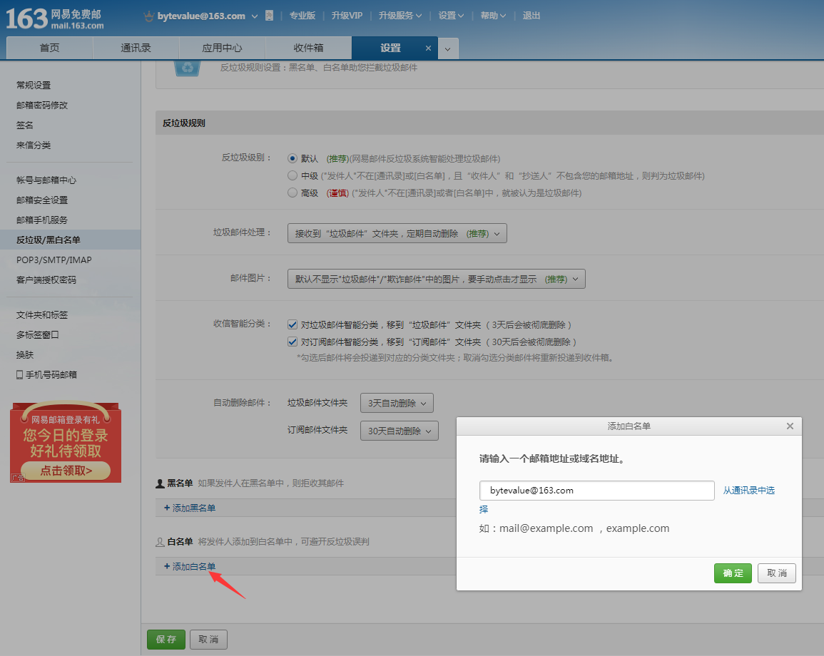 点击“添加白名单”,输入自己的邮箱地址 bytevalue@163.com (此处只是示例,实际填入自己对应的邮箱地址)