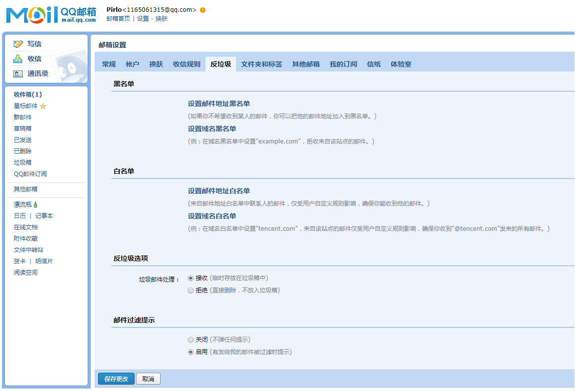 设置邮件白名单,点击[设置]→[常规设置],再点击左边栏的“反垃圾/黑白名单”