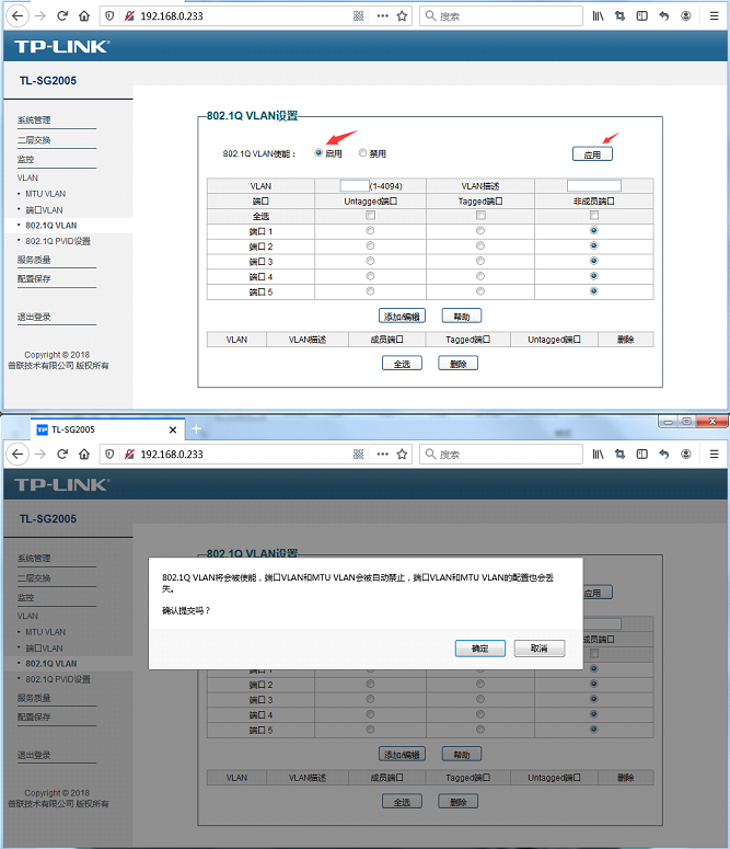 [VLAN] → [802.1Q VLAN] ,选择“启用”,点击应用,再点击确定提交。