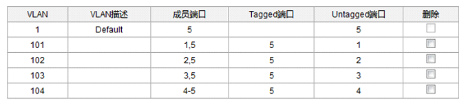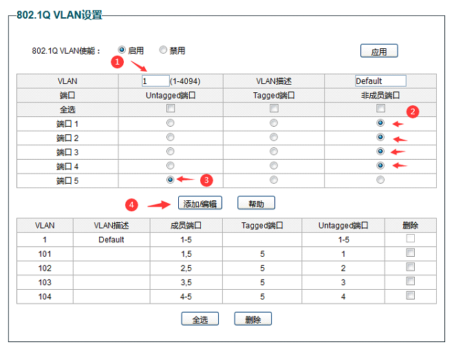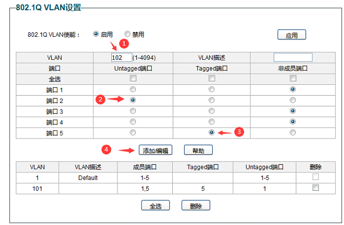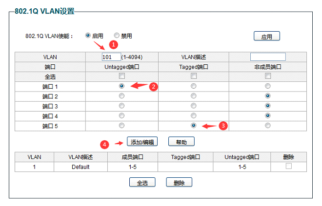 5,添加VLAN 101 ,关联端口1和端口5,端口1为Untaged端口 ,端口5为Tagged端口。2,3,4 端口为非成员端口。