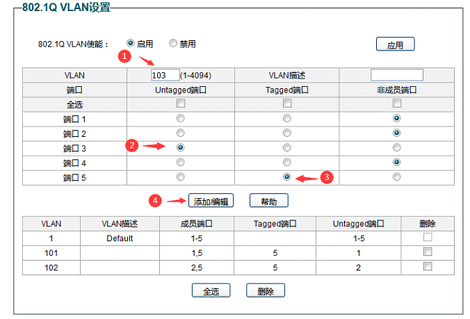 7,添加VLAN 103 ,关联端口3和端口5,端口3为Untaged端口 ,端口5为Tagged端口。1,2,4 端口为非成员端口。