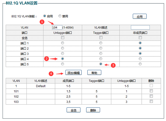 8,添加VLAN 104 ,关联端口4和端口5,端口4为Untaged端口 ,端口5为Tagged端口。1,2,3 端口为非成员端口。