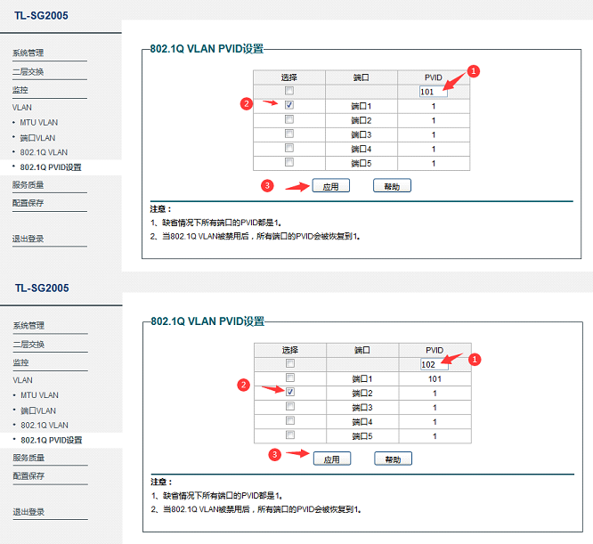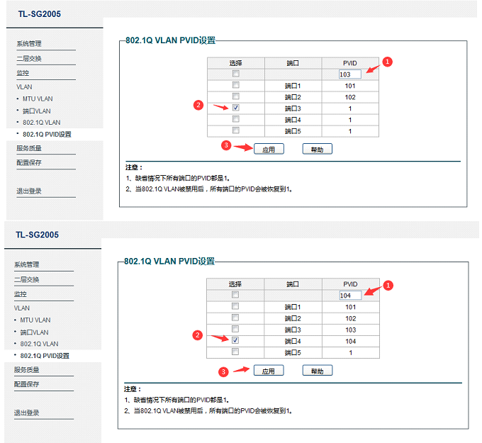 [VLAN] → [802.1Q协议PVID设置],分别配置