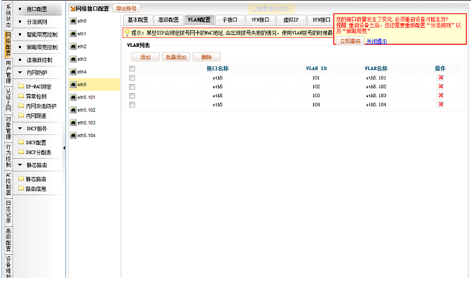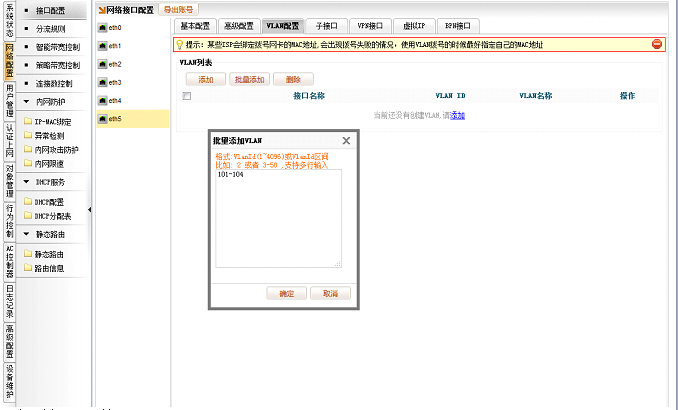 [网络配置]→[接口配置]→[eth5]→[VLAN配置],点击批量添加,输入101-104,点击确定