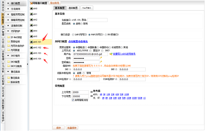 在百为路由的eth5.101 ,配置启用接口,并填入该宽带账号信息