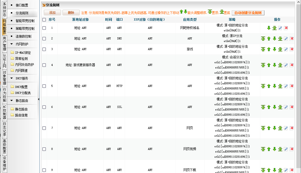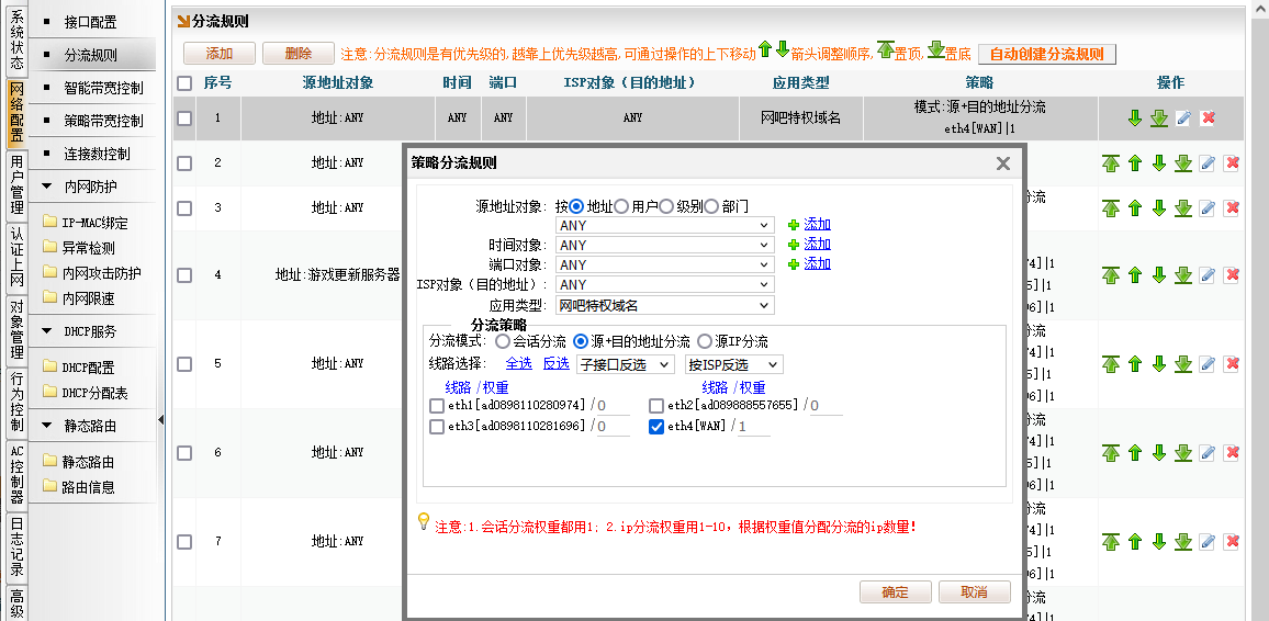 【网络配置】→【分流规则】→【添加】→应用类型【网吧特权域名】→会话模式【源+目的地址分流】→【确定】→然后把这条规则“置顶” 特权即可生效。