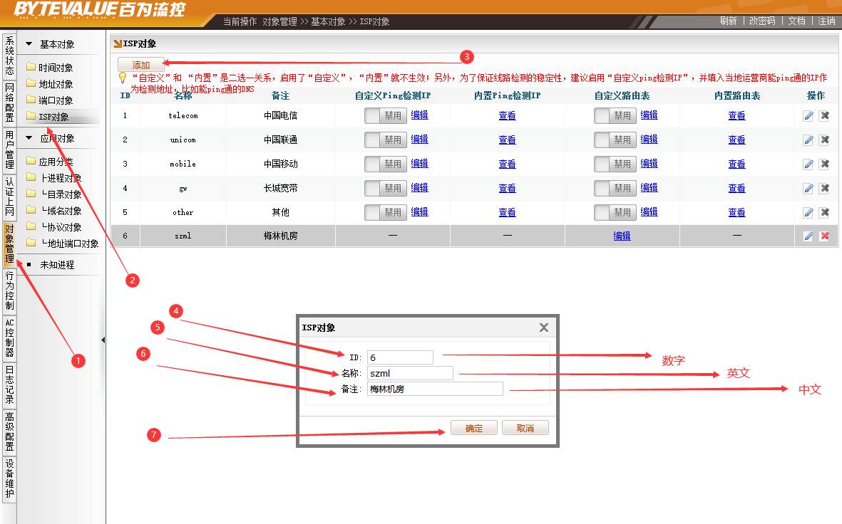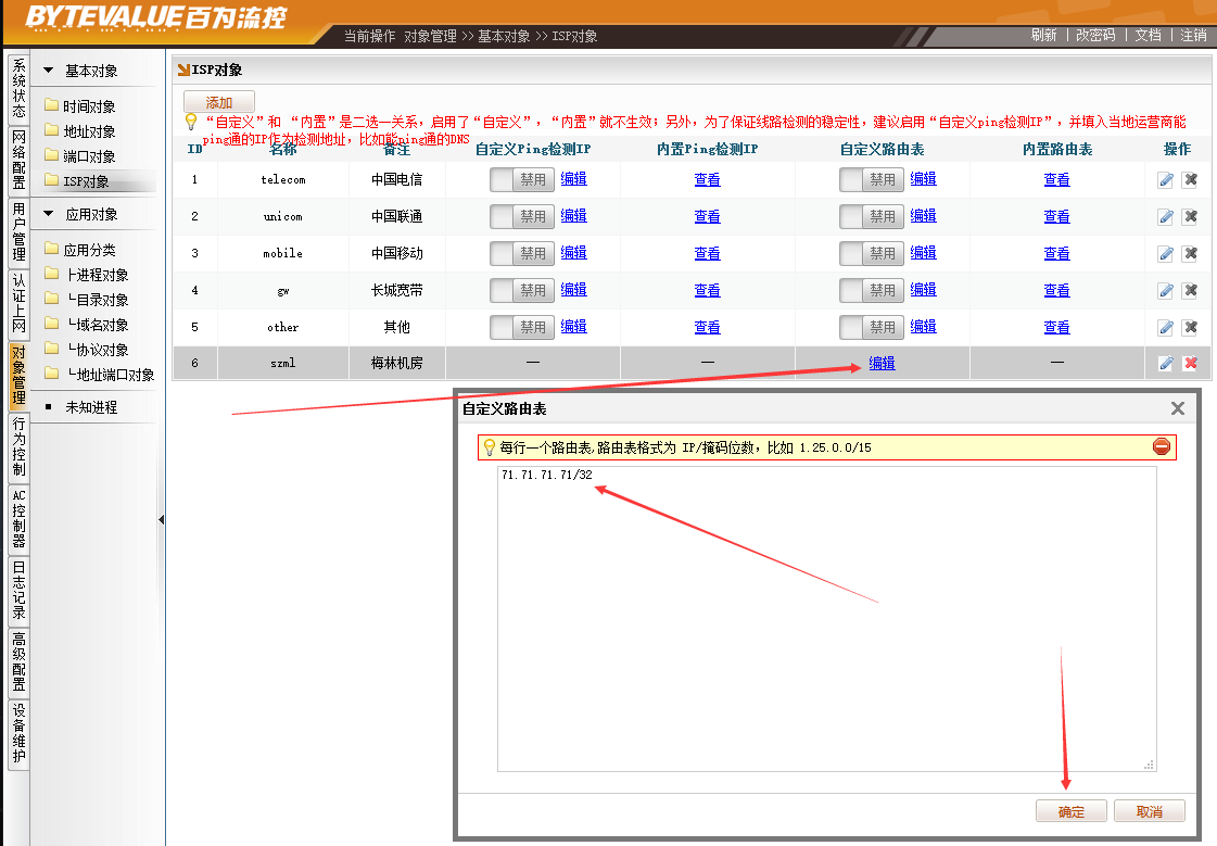 2.创建好ISP对象后 点击“编辑” 写入你要指定的外网ip和掩码位 一般建议/32的掩码位