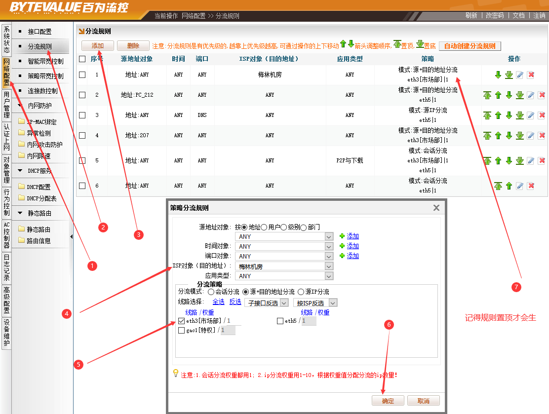 3.网络配置-分流规则 设置好ISP对象走一条外网出去 规则置顶