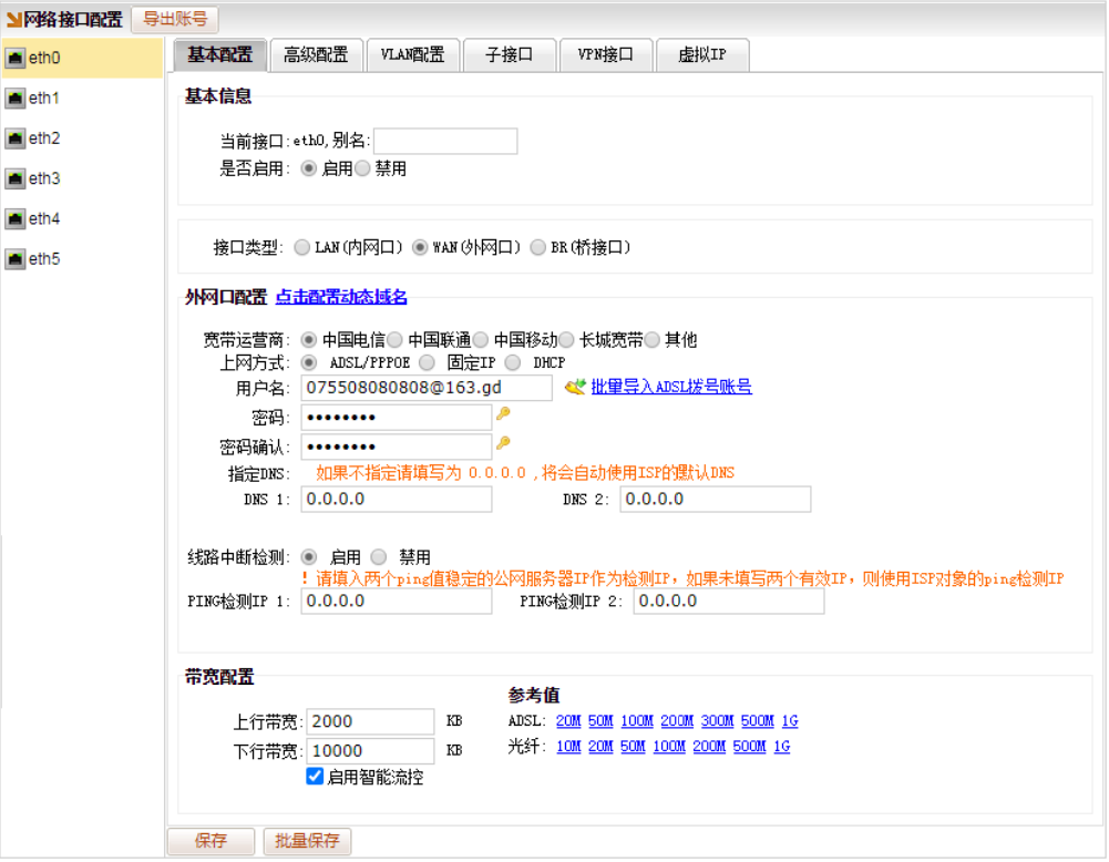 2.3、带宽配置——配置线路的带宽,比如上行 20M 下行 100M 的拨号光纤,可以配置上行为2000KB,下行 10000KB。配置线路带宽非常重要,智能流控根据所配的带宽自动限速。(需要勾选“启用智能流控”的勾选项,配置带宽的值才生效)