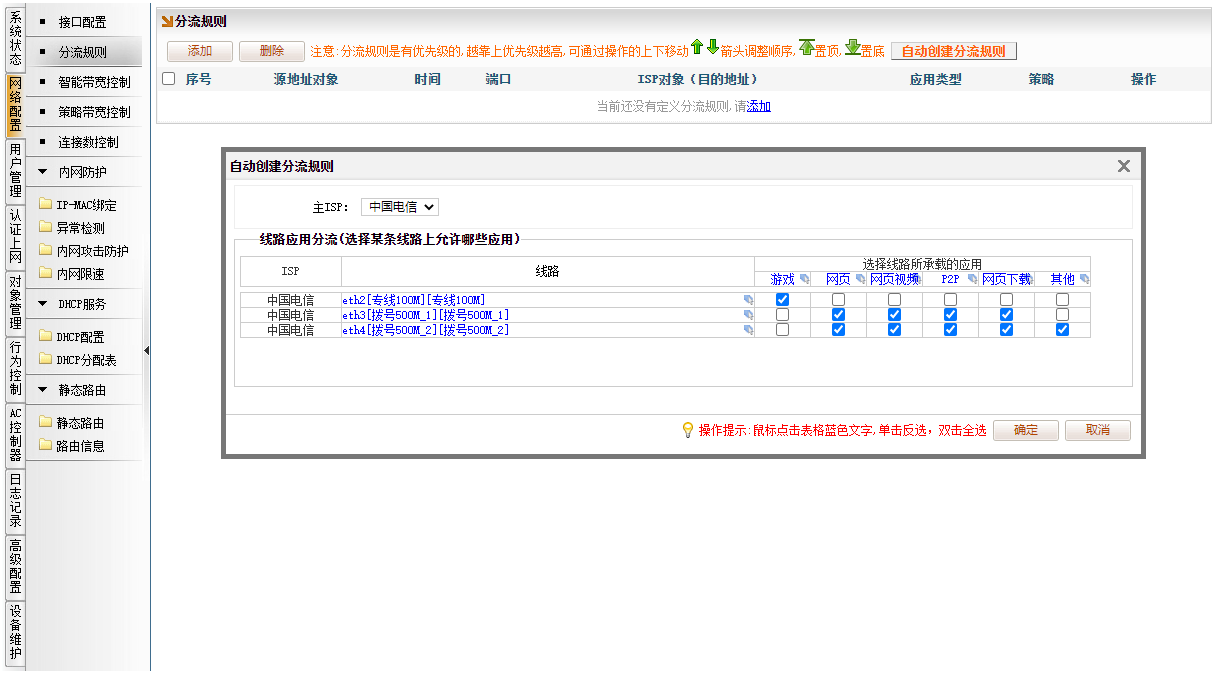 单线路可以不配置分流规则;多线路,必须配置分流规则。[网络配置]→[分流规则],点击“自动创建分流规则”。比如三个WAN口,通过自动创建分流规则,可选择线路承载哪些应用。勾选后点击“确定”。