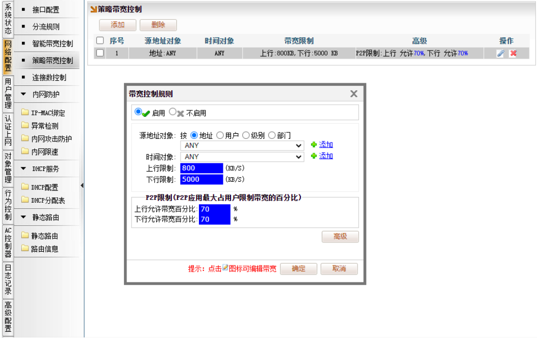[网络配置]→[策略带宽控制],点“添加”。每个机器上行不超过800KB,下行不超过5000KB。(ANY表示任意,即任何人、任何时间)。如下图所示,